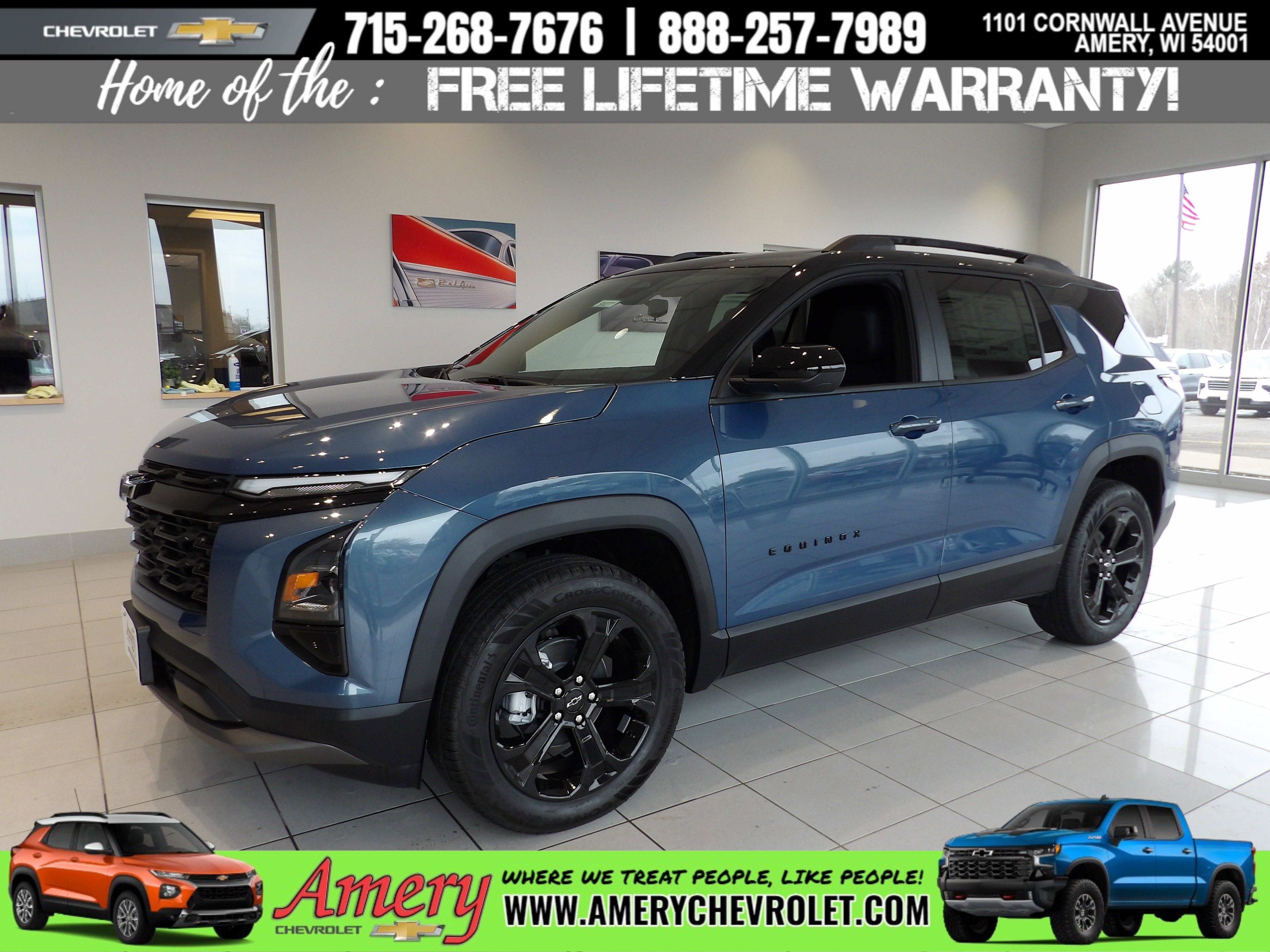 All Vehicles Manufacturers rebates apply to new vehicles, everyone qualifies! Prices do not include additional fees and costs of closing, including government fees and taxes, any finance charges, any service fees, any emissions testing fees or other fees. All prices, specifications and availability subject to change without notice. Contact dealer for most current information and to verify vehicle is still available. New vehicle pricing includes all offers and incentives based on residency. Tax, Title and License are not included in vehicle prices shown and must be paid by the purchaser. While Amery Chevrolet ensures the accuracy of the information on this site, errors sometimes do occur. Please verify your questions with our sales team by stopping into dealership or calling us directly at 715-268-7676.WHY CHOOSE AMERY CHEVROLET? IT'S SIMPLE -- We choose to put our customers needs first. Our New, Used and Certified Pre-Owned Vehicles pass an inspection or we don't sell it, period!! Your safety is our utmost concern. On top of that, qualifying new and pre-owned vehicles get our FREE Lifetime Warranty with purchase! Our Service Department is filled with Service Consultants and Certified Chevrolet Technicians that care and our Parts Department is fully stocked. We offer FREE loaners and FREE shuttles during your service, FREE Wi-Fi, fresh popcorn and coffee in our guest lounge. We take pride in working with each and every customer with honesty, integrity, and personalized customer service. You not only become a customer, you become our family! You can reach us at 715-268-7676 -or- 888-257-7989