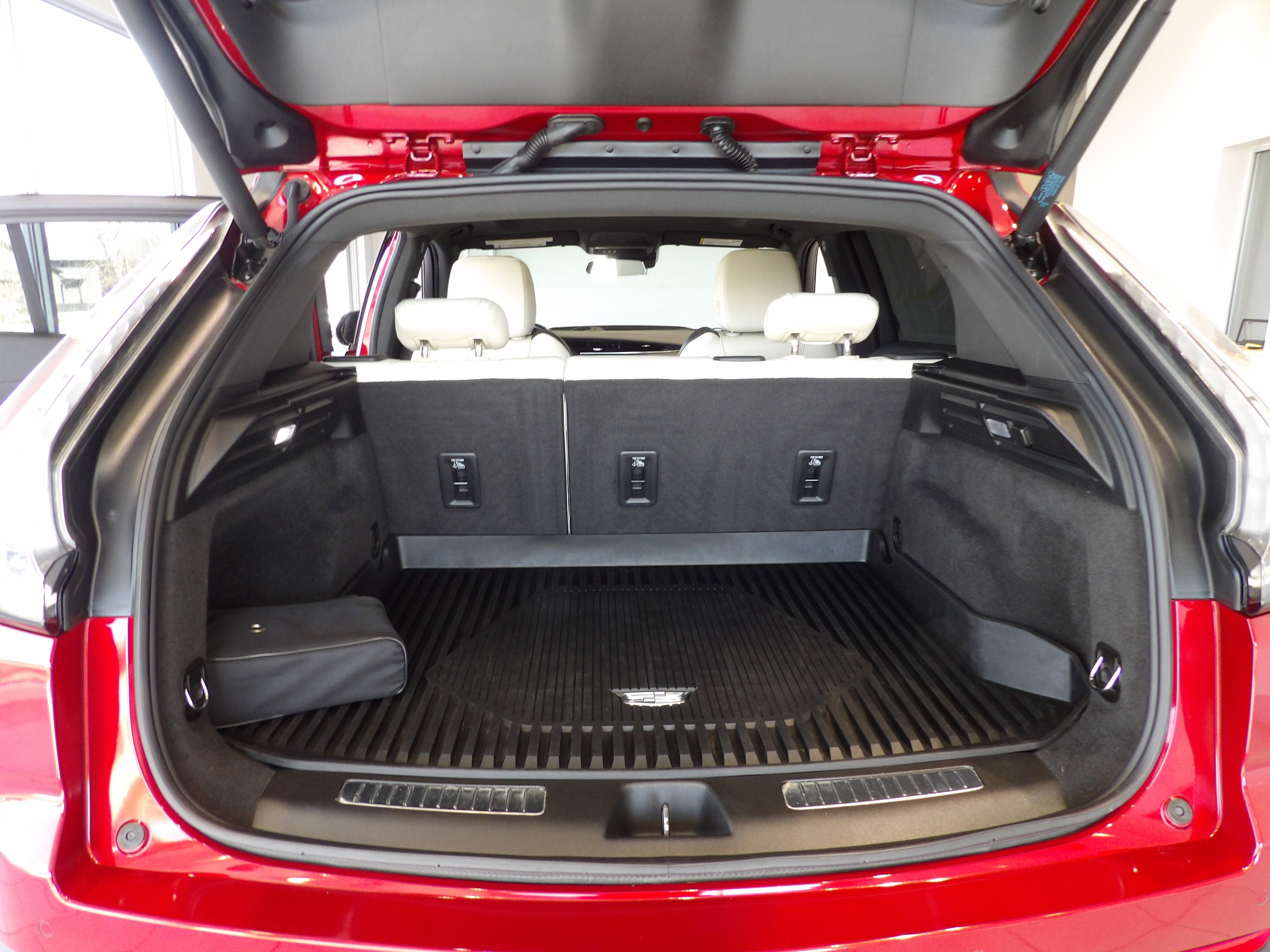 - Opens or closes when the system senses the key fob and the driver extends their foot under the left-hand side of the rear bumper over an image of the Cadillac Crest projected under the vehicle