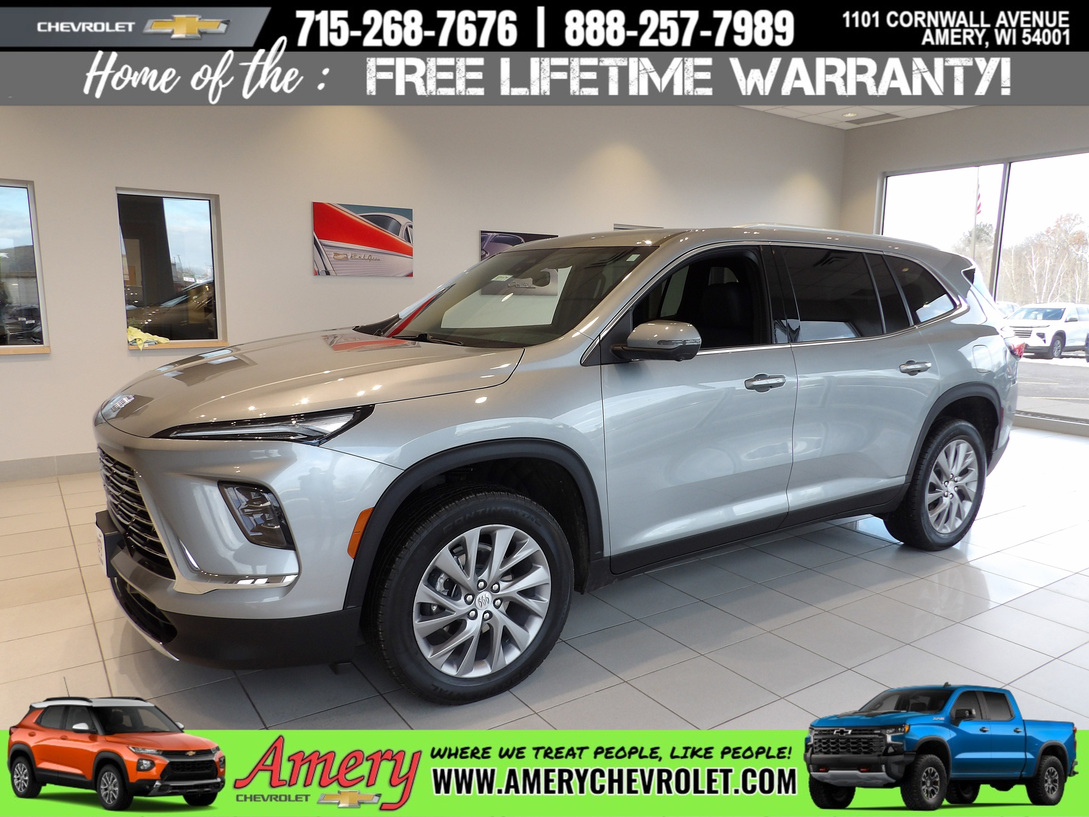 All Vehicles Manufacturers rebates apply to new vehicles, everyone qualifies! Prices do not include additional fees and costs of closing, including government fees and taxes, any finance charges, any service fees, any emissions testing fees or other fees. All prices, specifications and availability subject to change without notice. Contact dealer for most current information and to verify vehicle is still available. New vehicle pricing includes all offers and incentives based on residency. Tax, Title and License are not included in vehicle prices shown and must be paid by the purchaser. While Amery Chevrolet ensures the accuracy of the information on this site, errors sometimes do occur. Please verify your questions with our sales team by stopping into dealership or calling us directly at 715-268-7676.WHY CHOOSE AMERY CHEVROLET? IT'S SIMPLE -- We choose to put our customers needs first. Our New, Used and Certified Pre-Owned Vehicles pass an inspection or we don't sell it, period!! Your safety is our utmost concern. On top of that, qualifying new and pre-owned vehicles get our FREE Lifetime Warranty with purchase! Our Service Department is filled with Service Consultants and Certified Chevrolet Technicians that care and our Parts Department is fully stocked. We offer FREE loaners and FREE shuttles during your service, FREE Wi-Fi, fresh popcorn and coffee in our guest lounge. We take pride in working with each and every customer with honesty, integrity, and personalized customer service. You not only become a customer, you become our family! You can reach us at 715-268-7676 -or- 888-257-7989